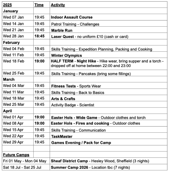 All Wed evening meetings are in FULL Scout Uniform (with Badges) and finish at 21:30 unless otherwise stated.