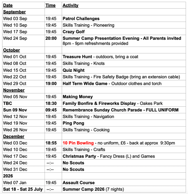 All Wed evening meetings are in FULL Scout Uniform (with Badges) and finish at 21:30 unless otherwise stated.